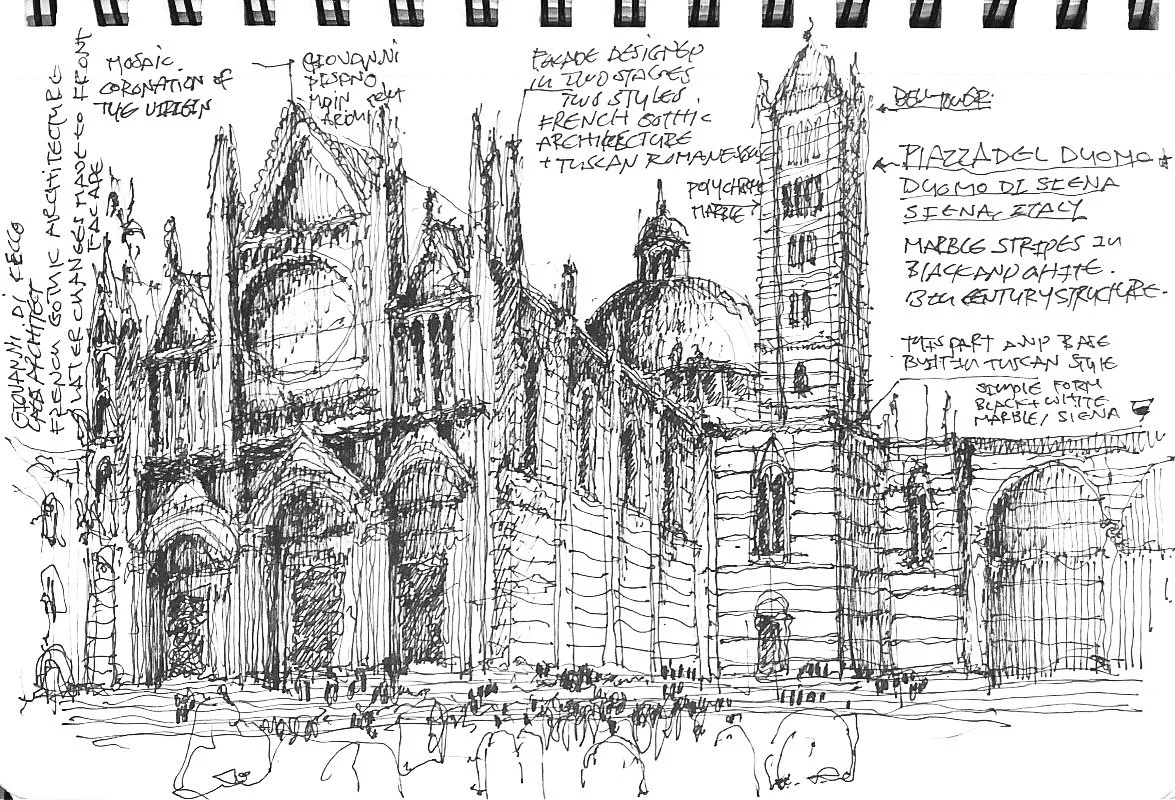 I started sketching the piazza while sitting at one of the beautiful cafes around it. After finishing my sketch, I decided to explore other areas, including the cathedral, Duomo di Siena.